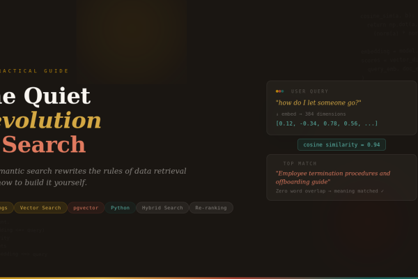 A Practical Guide for Programmers The Quiet Revolution: How Semantic Search Is Rewriting the Rules of Data Retrieval For thirty years, we searched by matching words. Now machines understand what we mean. Here is how it works — and how to build it yourself.